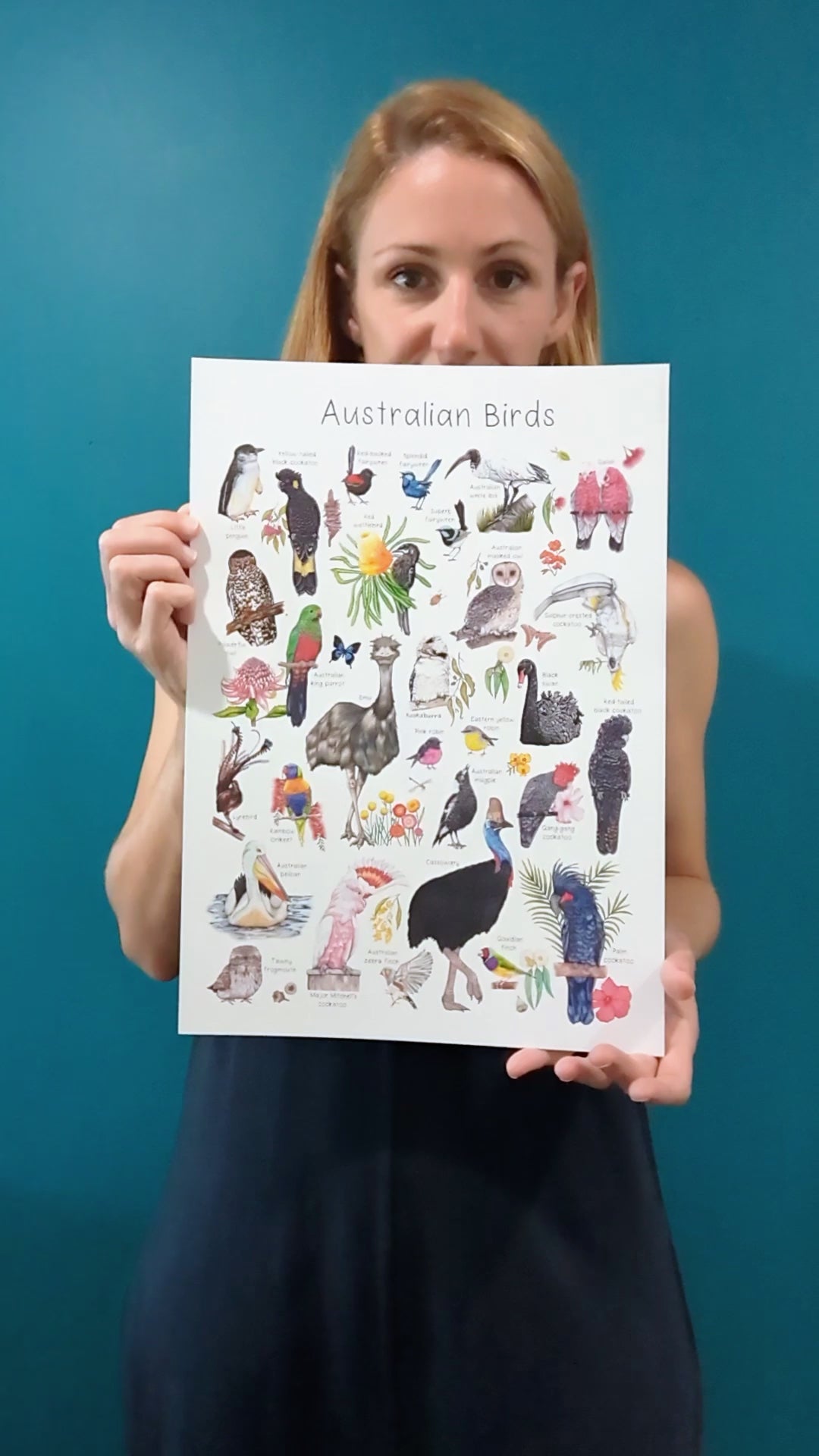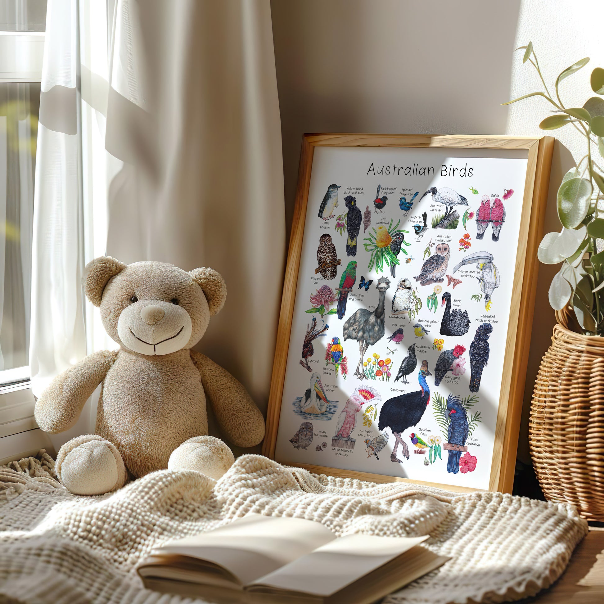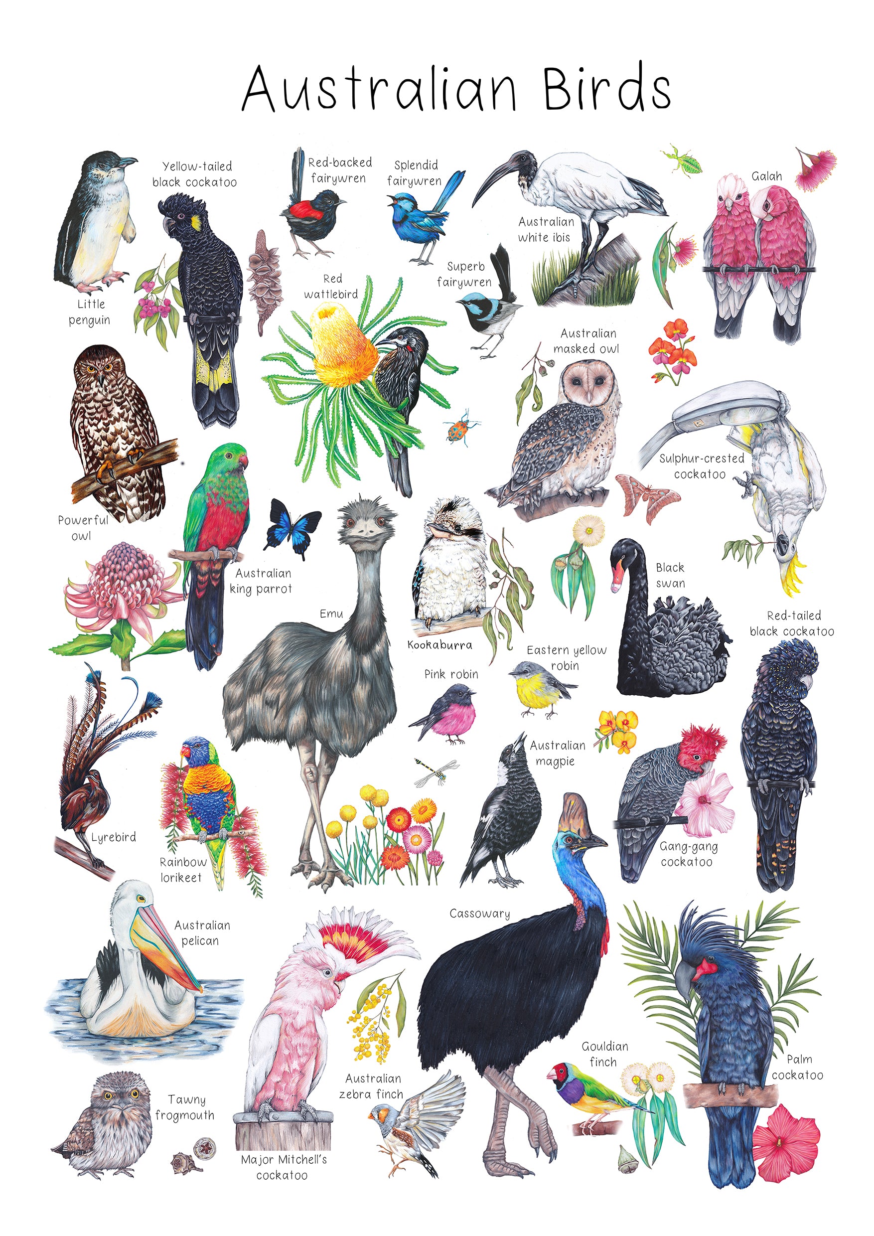 A bright and colourful kids’ resource, hand-drawn poster of native Australian birds.