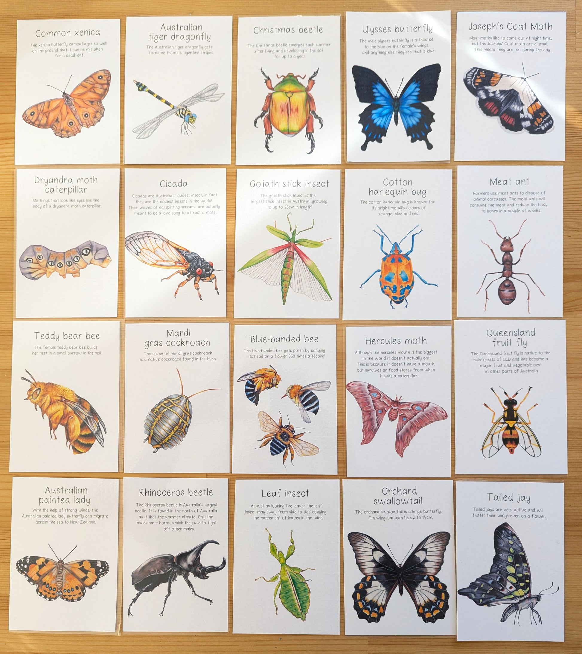 20 wonderful creepy-crawlies and fluttering insects found in Australia. Each card comes with a kid friendly fun fact about the creature.