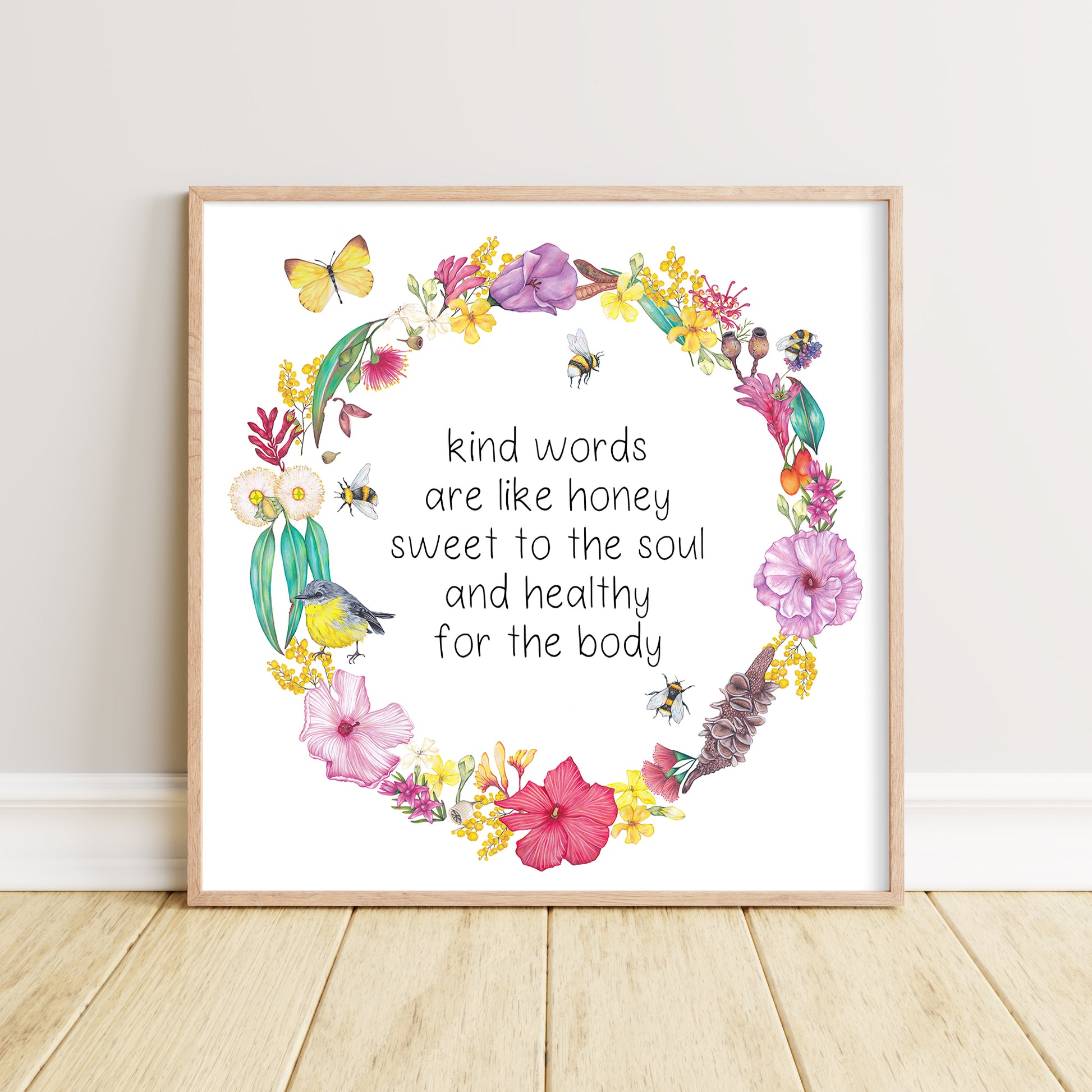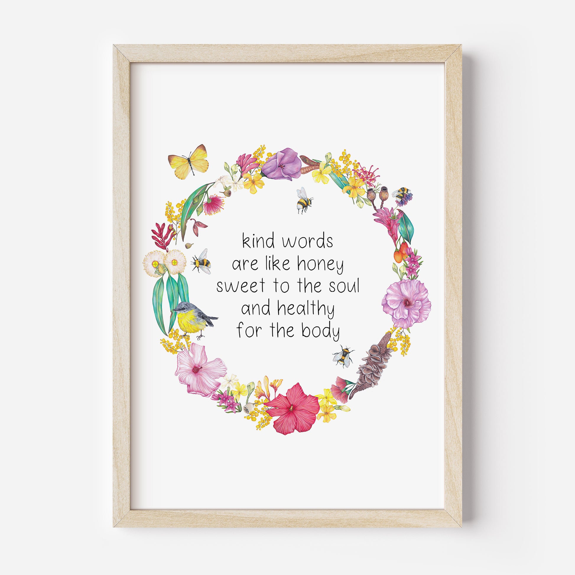 A wise and beautiful proverb (Proverbs 16:24) about the power of being positive to each other. Surrounded by a wreath of beautiful Australian nature and wildlife.
