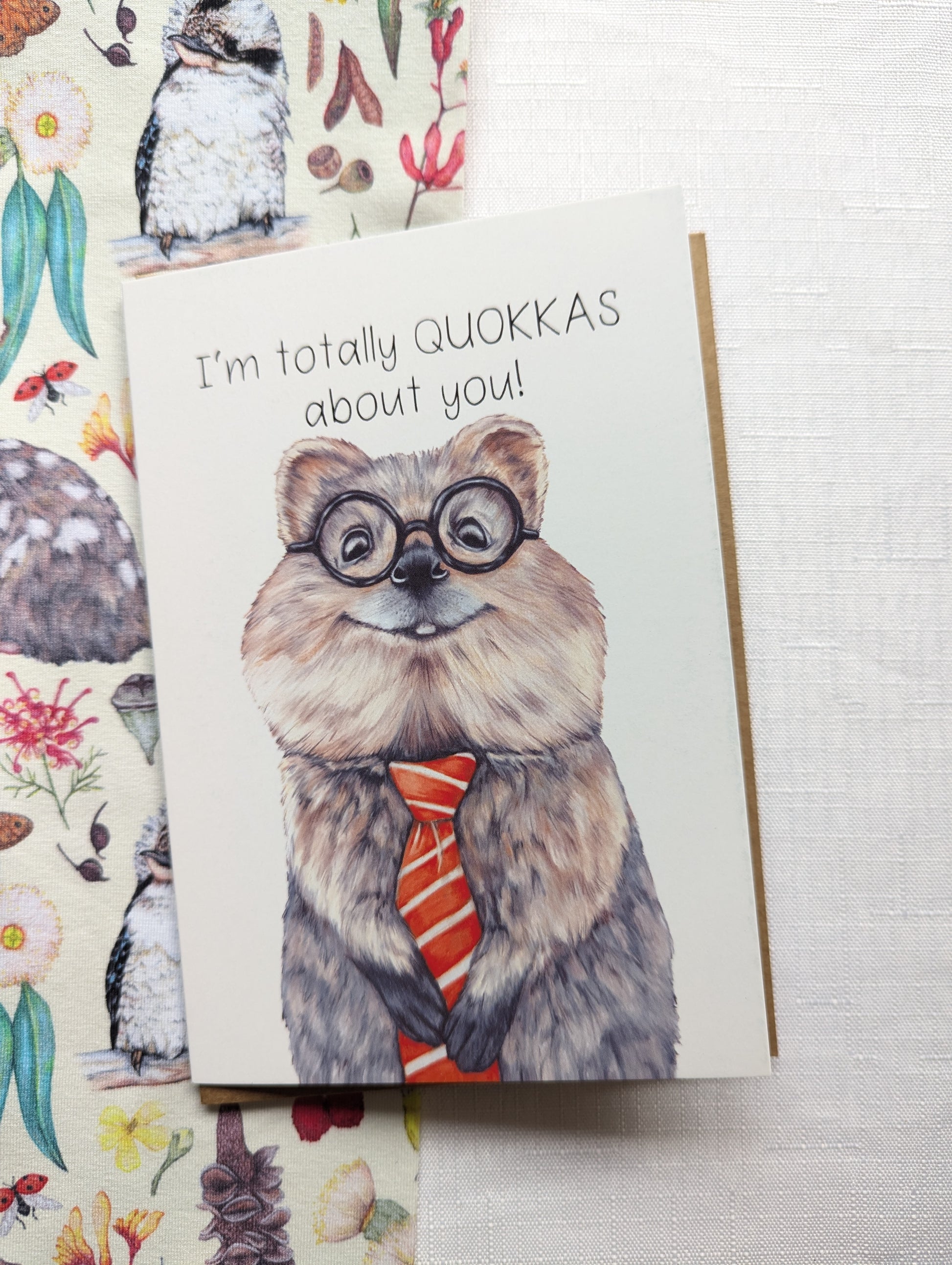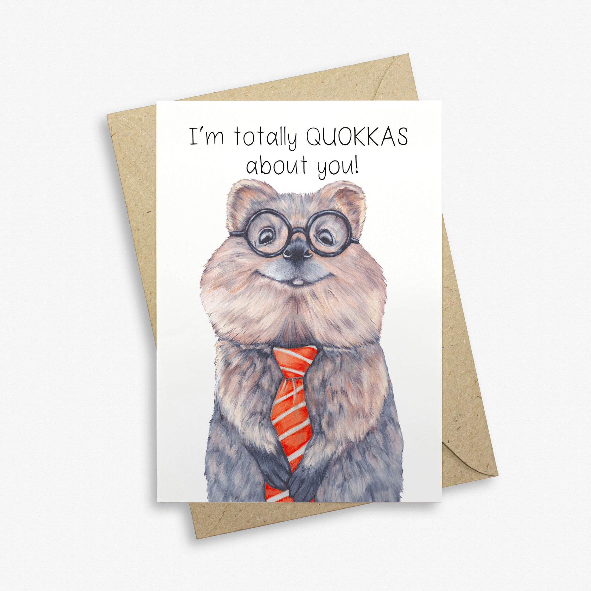 Adorable Quokka sending a message of love! A unique Aussie themed greetings card with funny pun.