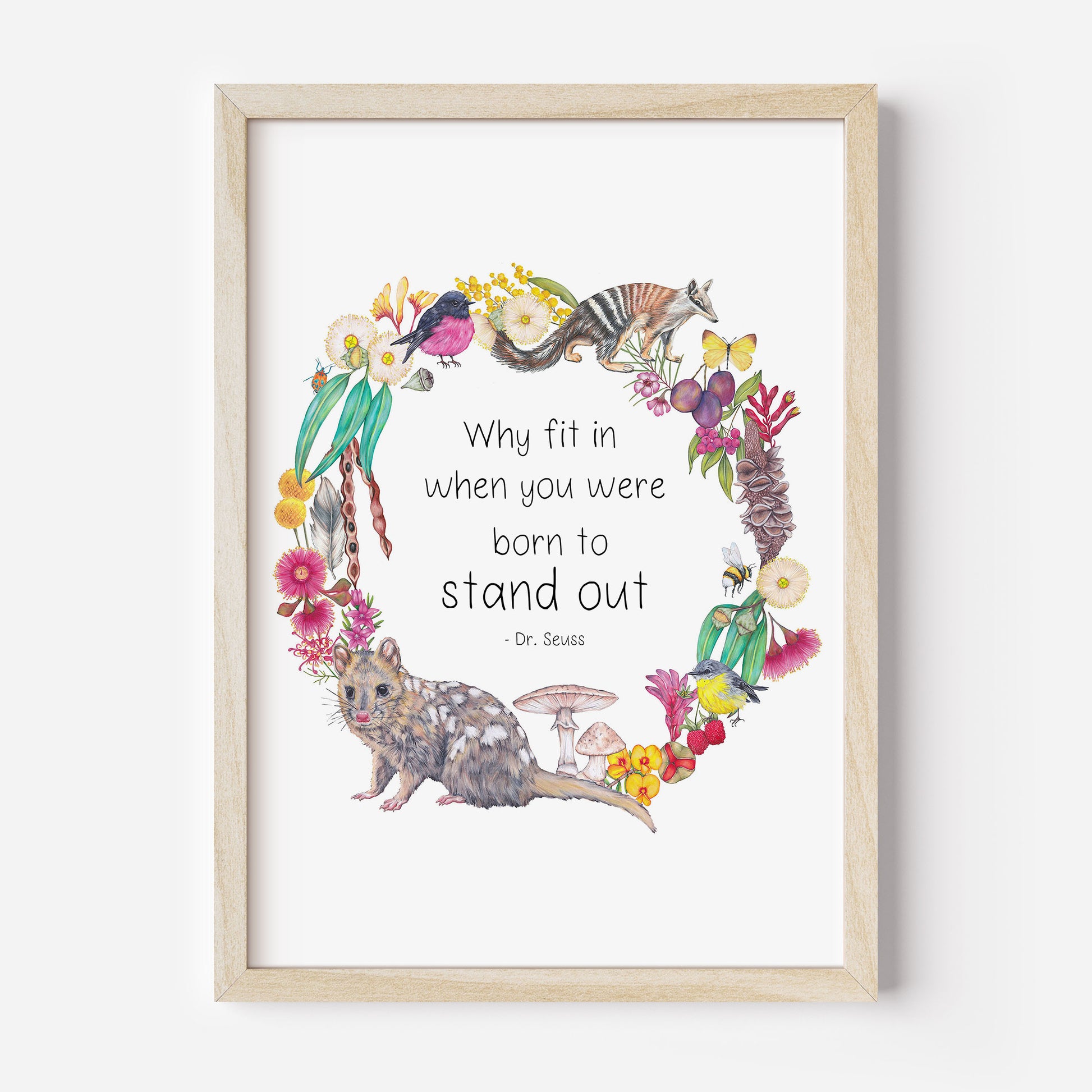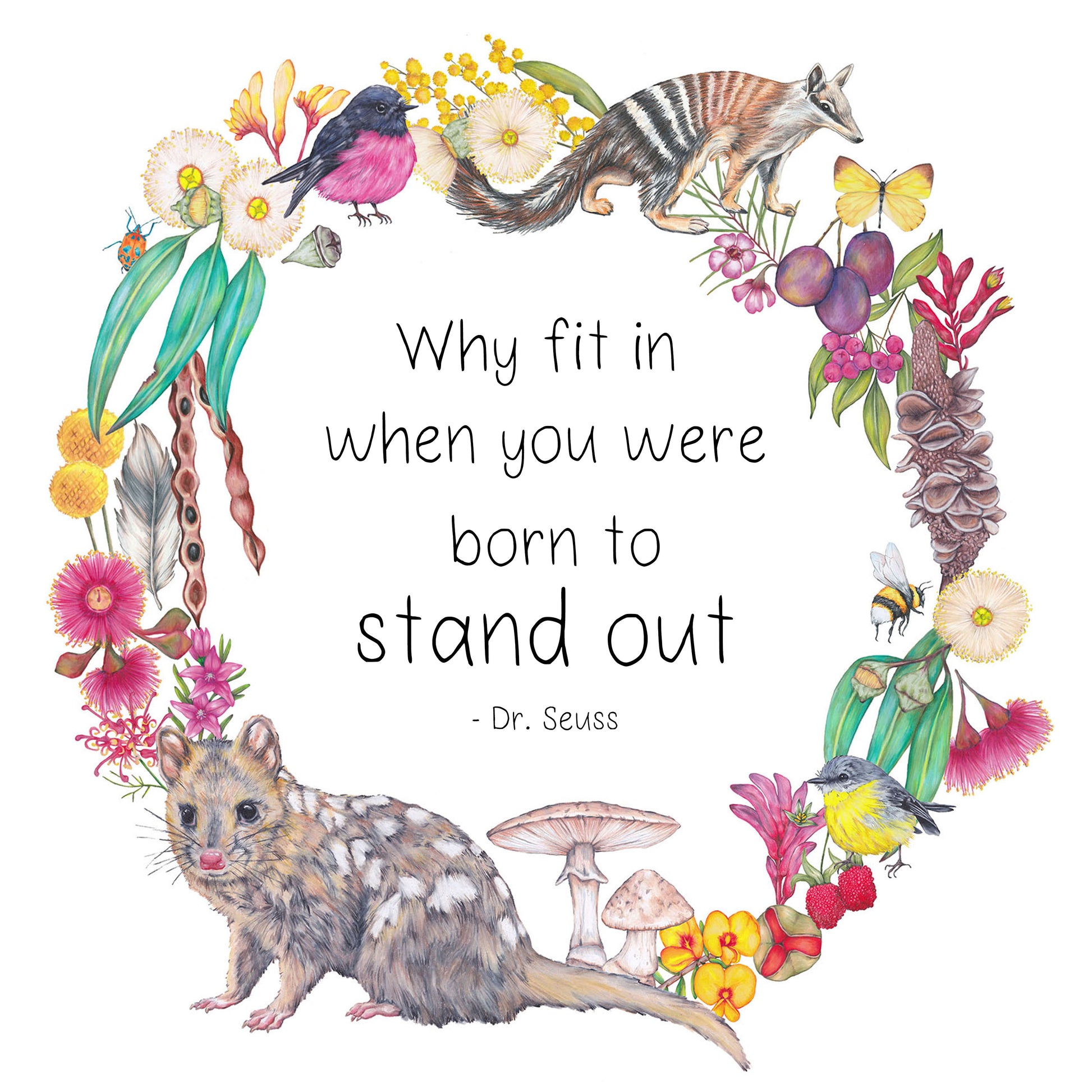 Motivational quote about being true to yourself, surrounded by a beautiful wreath of iconic and unique Australian nature and wildlife.